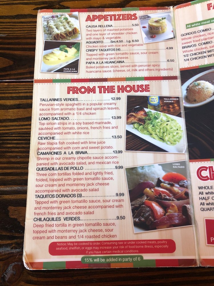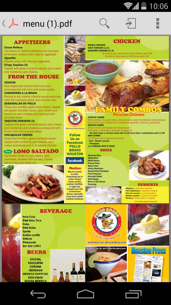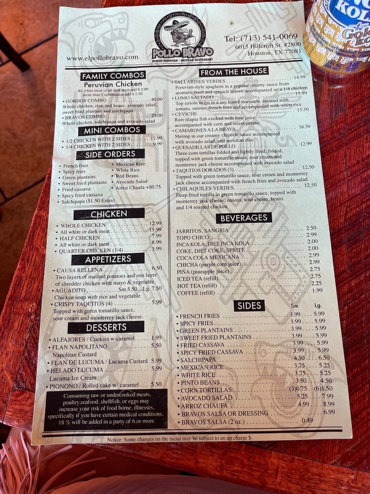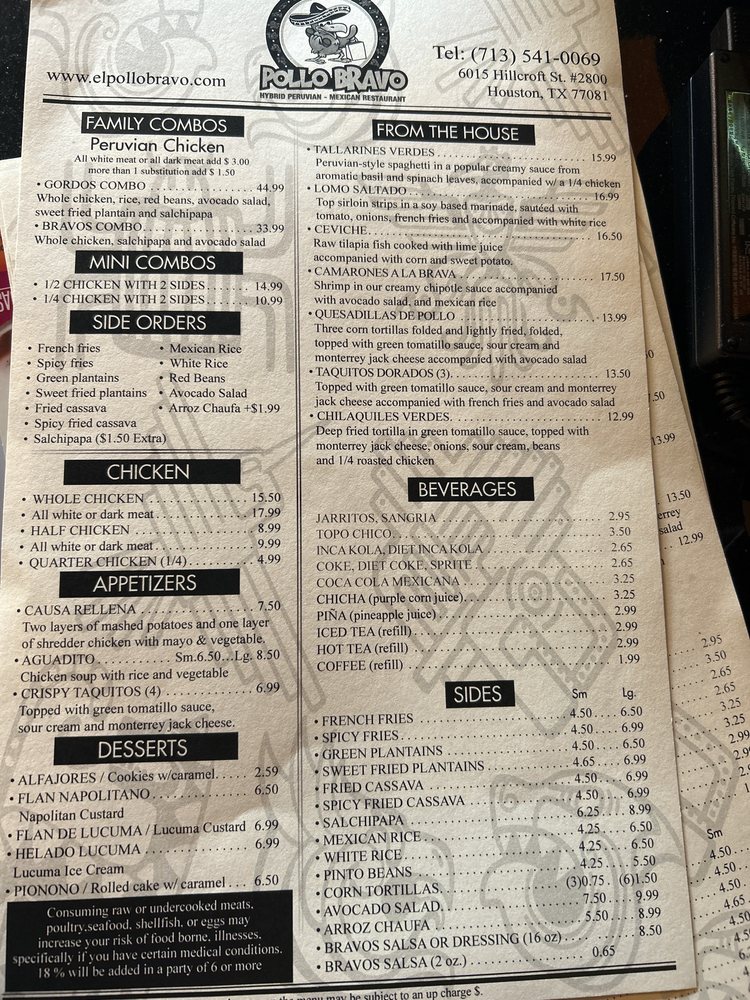 Introducing the menu at Pollo Bravo, a Peruvian-Mexican chicken shop in Houston, TX. The offerings include appetizers like Causa Rellena and Aguadito Chicken soup. The main attraction is the variety of chicken dishes, from Half All White Meat Chicken to Lomo Saltado with top sirloin strips. The menu also boasts unique dishes like Tallarines Verdes and Chilaquiles Verdes. Customers rave about the flavorful chicken and reasonable prices, with some noting the cozy ambiance and good service. While portions may be a concern for some, the overall quality and taste of the dishes shine at Pollo Bravo. Don't miss out on experiencing the fusion of Peruvian and Mexican flavors in each bite.